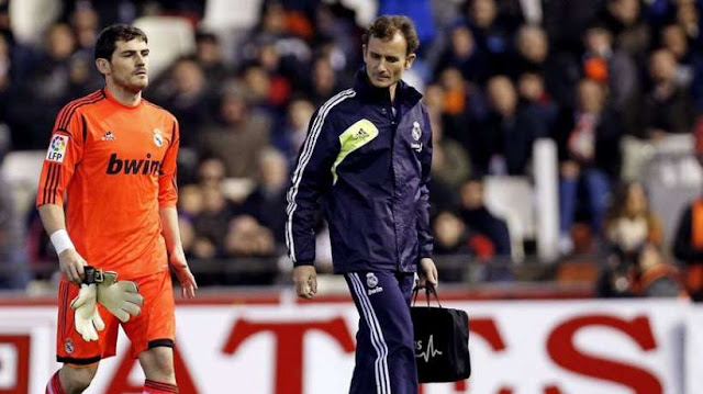 و كان كاسياس قد أصيب بكسر في ذراعه خلا ل مباراة فريقه أمام فالينسيا في إياب دور الثمانية لبطولة كأس ملك أسبانيا، ليضطر حارس المنتخب الاسباني إلى وضع يده في "الجبس".